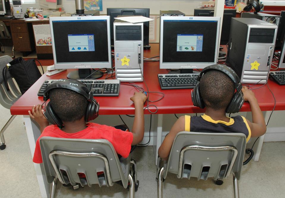 Kindergartners Deandre Henderson, left, and Zaveon Jackson take computer tests at the Jerry Lee Faine Elementary School in Dothan, Alabama. (Kari Goodnough/Bloomberg News)